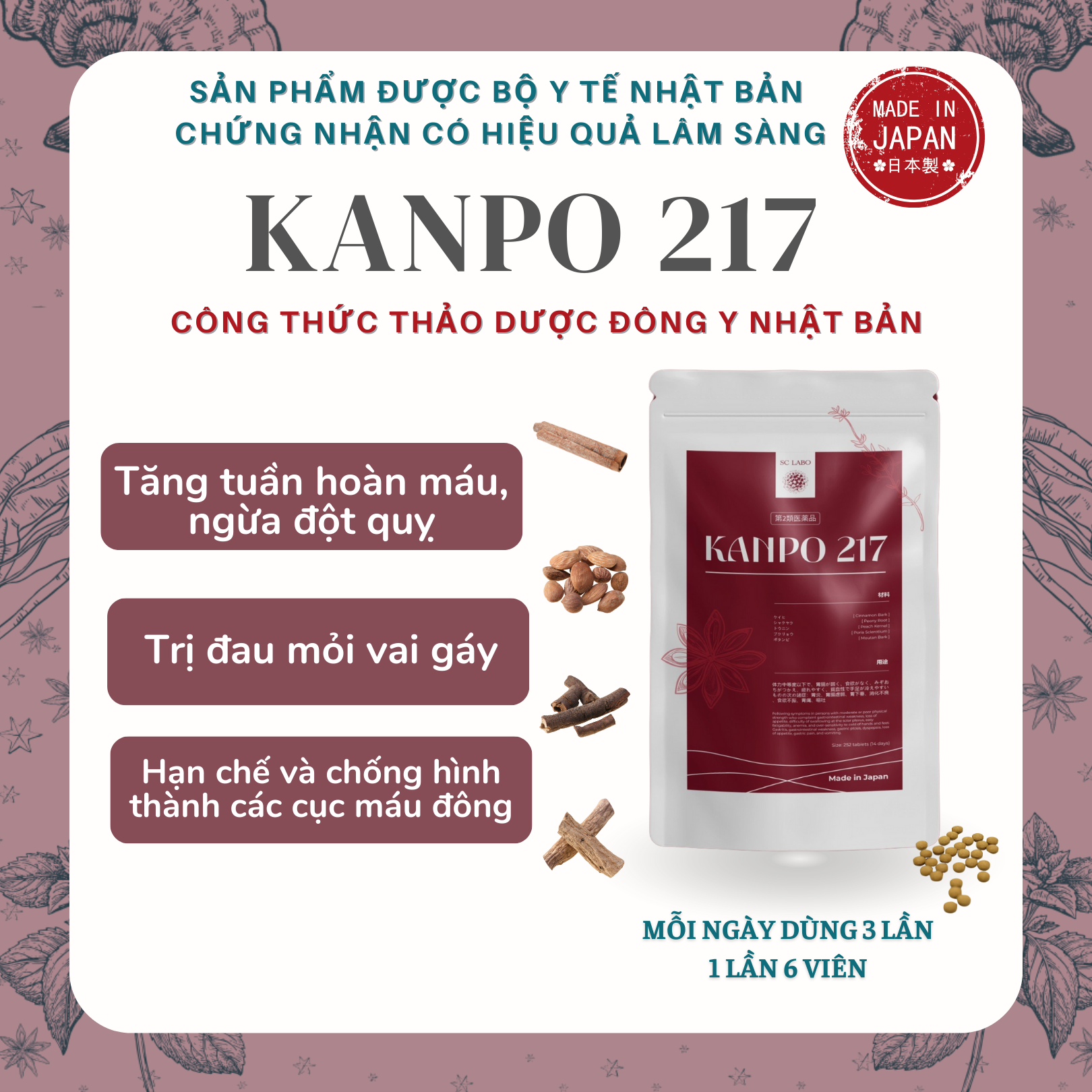 ・ Kanpo 217 có tác dụng tăng tuần hoàn máu, điều hoà các chức năng trong cơ thể và cân bằng hormone