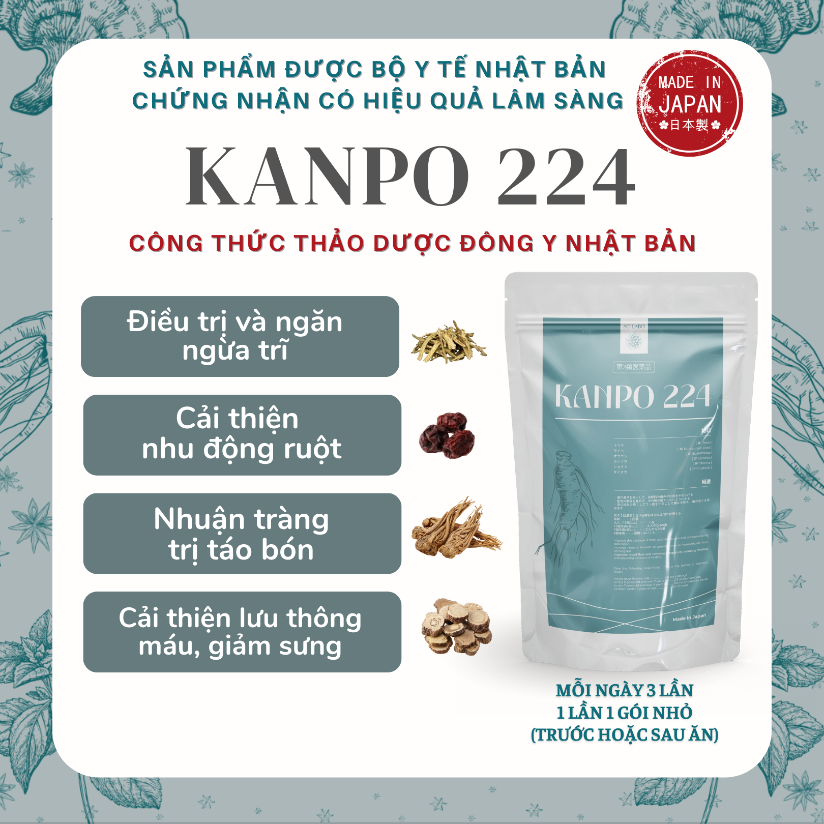 Cách dùng / Liều lượng KANPO 224 – Nhuận tràng, ngăn ngừa trĩ, giảm đau khi đại tiện.